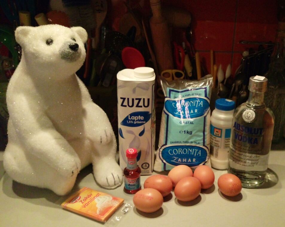 Gata cu vorbăria, haideți în bucătărie. Puneți pe masa de lucru toate ingredientele necesare: 6 gălbenușuri– dacă aveți ouă de casă, e perfect, o să ofere o culoare mai intensă băuturii, 500 g zahăr, 1 litru de lapte rece cu 3,5 % grăsime, 500 ml alcool rafinat (87-95 grade) sau votcă, 4 pliculețe de vanilie, 1 sticluță cu esență de rom și un praf de sare.